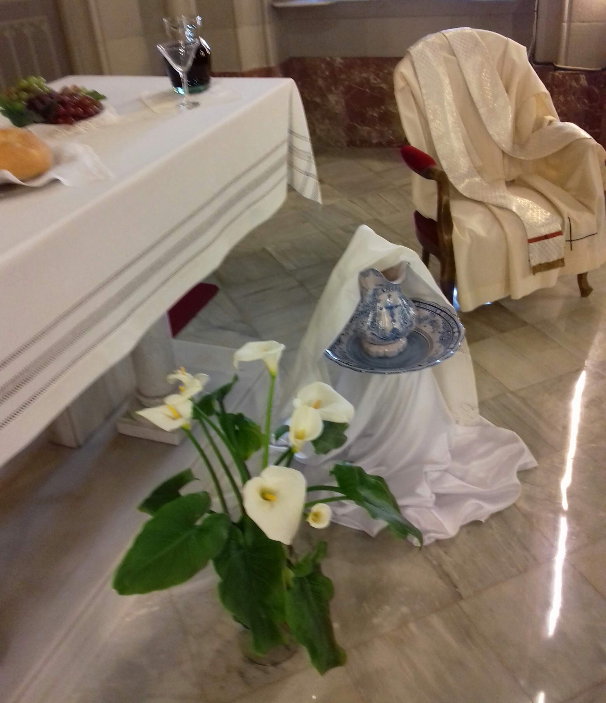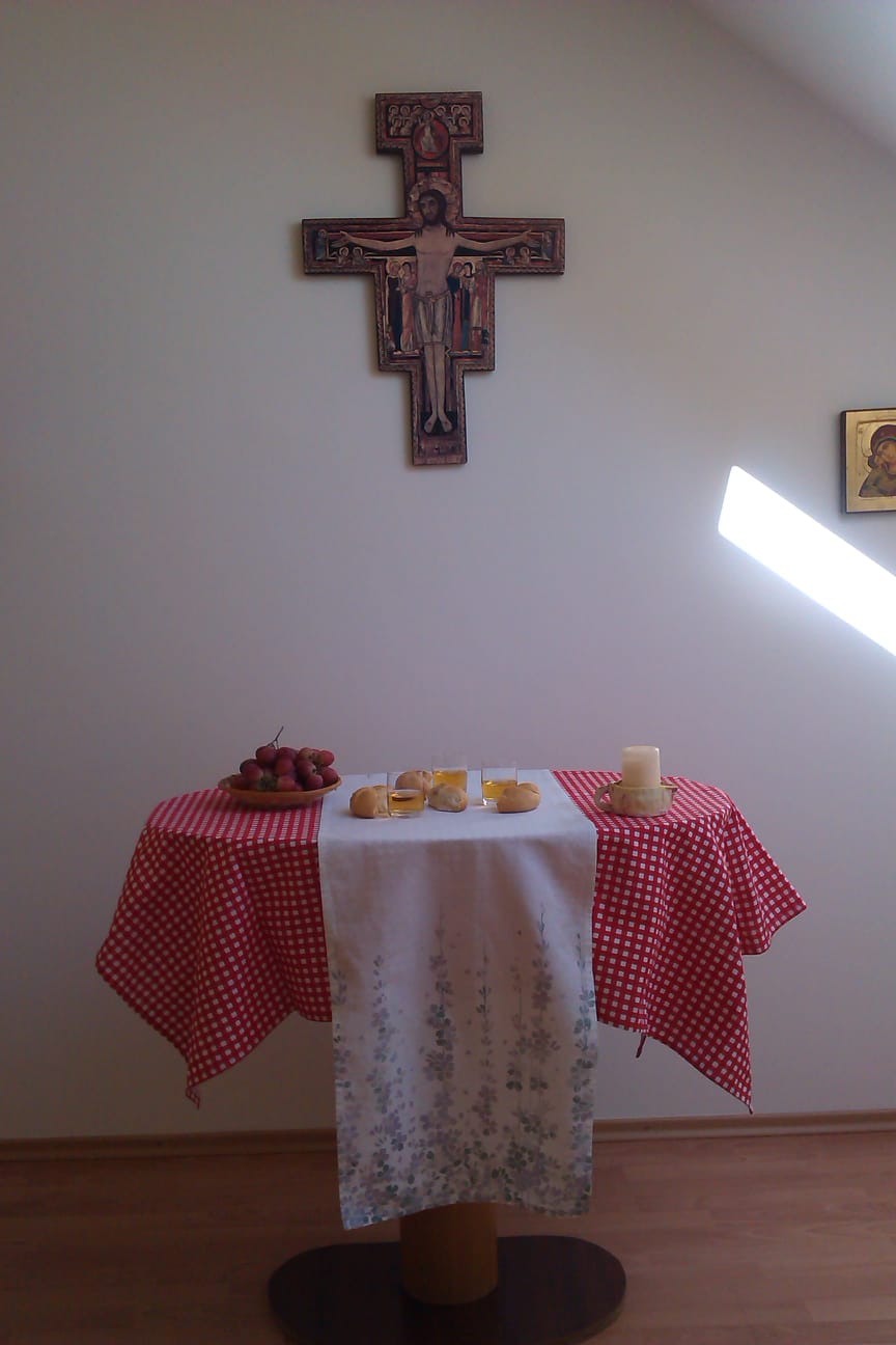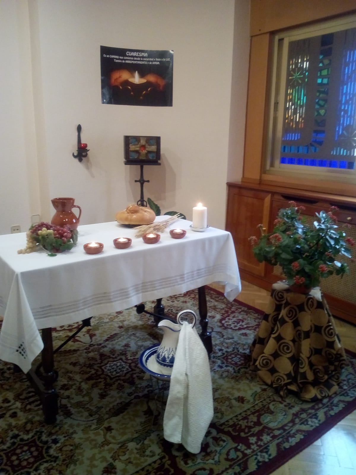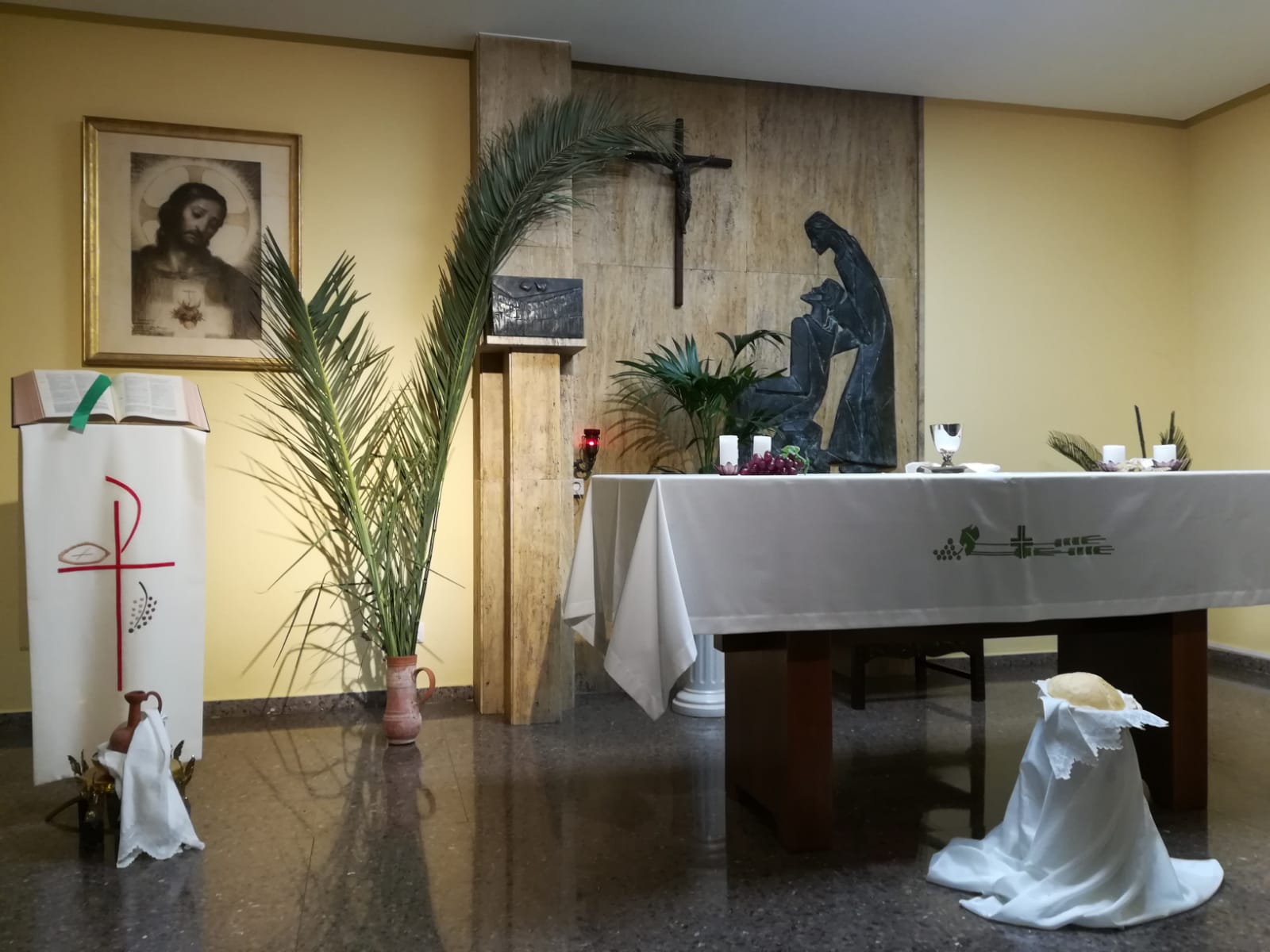 Los símbolos que preparamos nos ayudaron a centrarnos más en este Jueves Santo, día del amor fraterno, en el que Jesús nos dejó el memorial de su entrega hasta el extremo, en el pan y el vino. La jofaina y el agua para lavarnos los pies los unos a los otros, porque esta es la señal por la que nos reconocerán como discípulos suyos, si nos amamos unos a otros como El, el Maestro nos ha amado. Gracias a los medios de comunicación se nos brinda la posibilidad de participar de los oficios y en este día, de la Eucaristía en la Cena del Señor.
