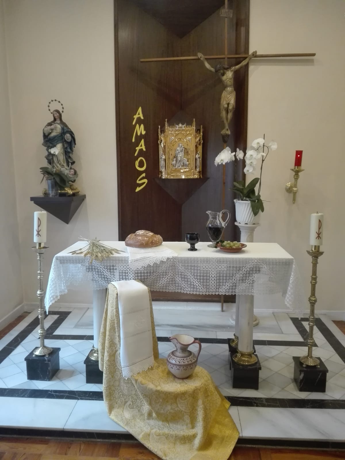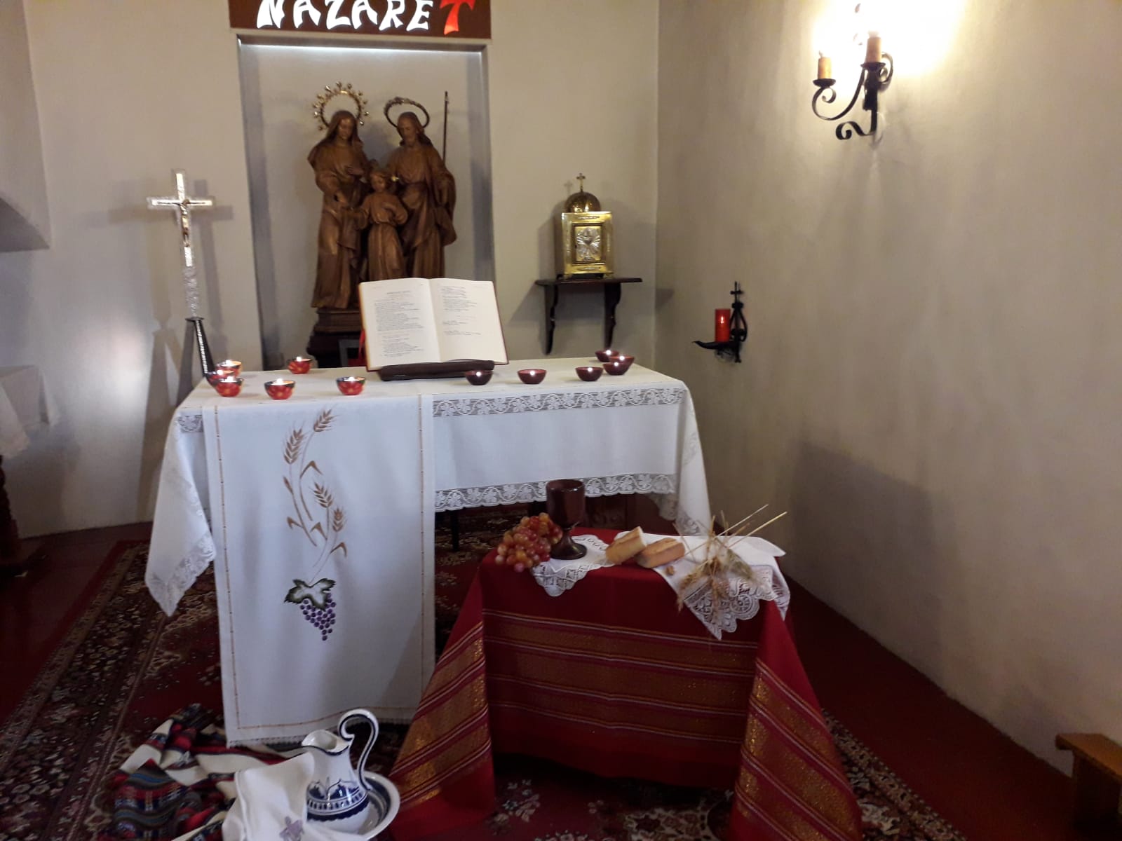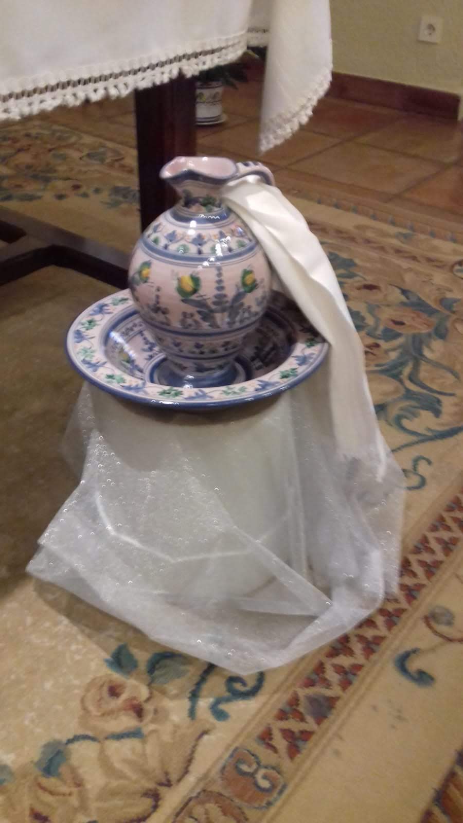 Los símbolos que preparamos nos ayudaron a centrarnos más en este Jueves Santo, día del amor fraterno, en el que Jesús nos dejó el memorial de su entrega hasta el extremo, en el pan y el vino. La jofaina y el agua para lavarnos los pies los unos a los otros, porque esta es la señal por la que nos reconocerán como discípulos suyos, si nos amamos unos a otros como El, el Maestro nos ha amado. Gracias a los medios de comunicación se nos brinda la posibilidad de participar de los oficios y en este día, de la Eucaristía en la Cena del Señor.