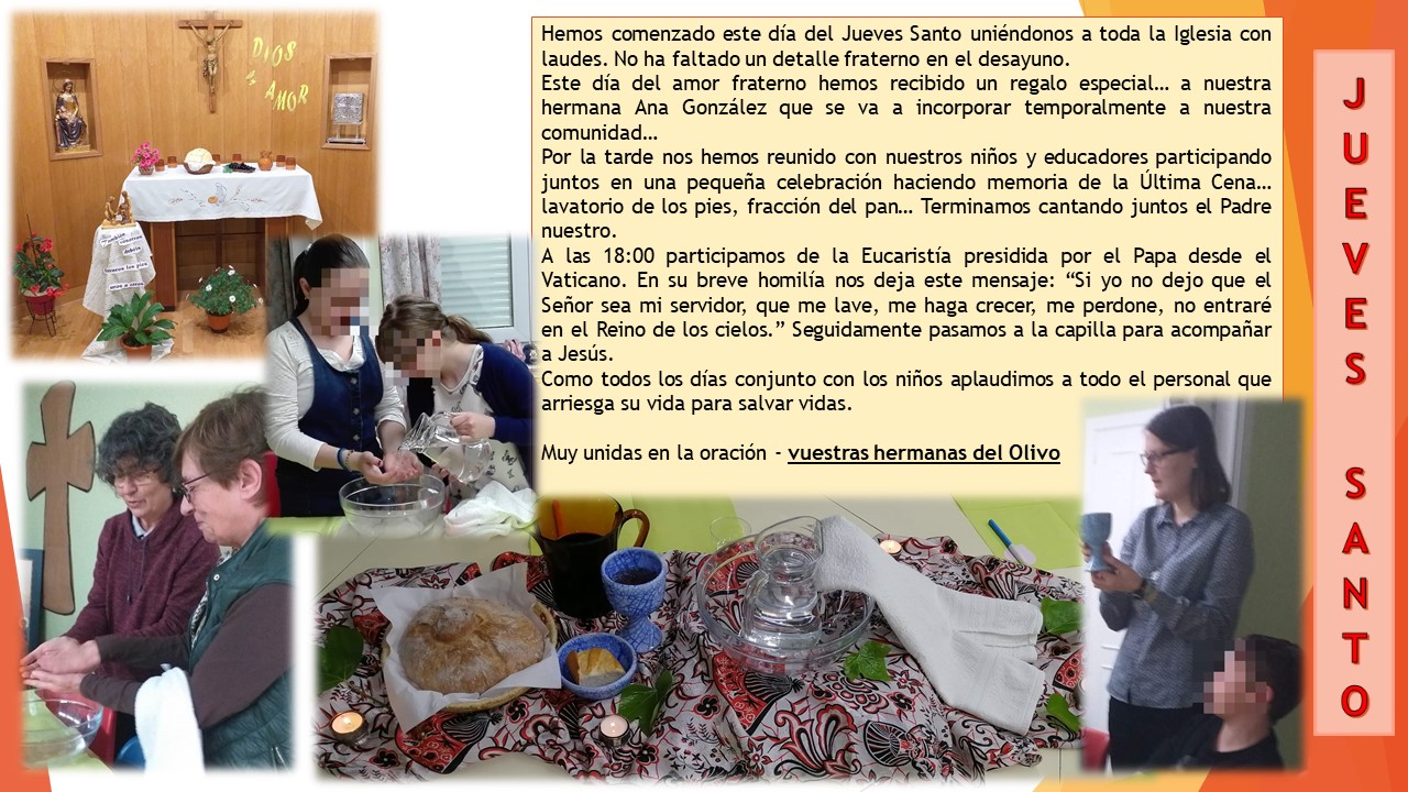 Con la celebración de Laudes nos dispusimos ya para vivir este Triduo pascual. A mediodía, compartimos la rica comida que, en este día del amor fraterno, nos preparó la Hna Puri, con su experiencia y dedicación. Mesa adornada con detalles, flores, regalos… y por la tarde, participamos en la Eucaristía con el Santo Padre, a través de la TV., a diferencia de otros años que en estos días estábamos realizando los Ejercicios Espirituales, que se tuvieron que suspender. Pero experimentamos que esta situación está ayudando a vivir con mayor intensidad y hondura el gran Misterio de un Señor Jesús que se hace Eucaristía que se queda para siempre para ser ALIMENTO Y COMPAÑÍA, en este peregrinaje de la vida. Hoy más que nunca, la humanidad entera lo necesitamos. Sus palabras: ”Yo estaré con vosotros, todos los días hasta el fin del mundo” son nuestra certeza.