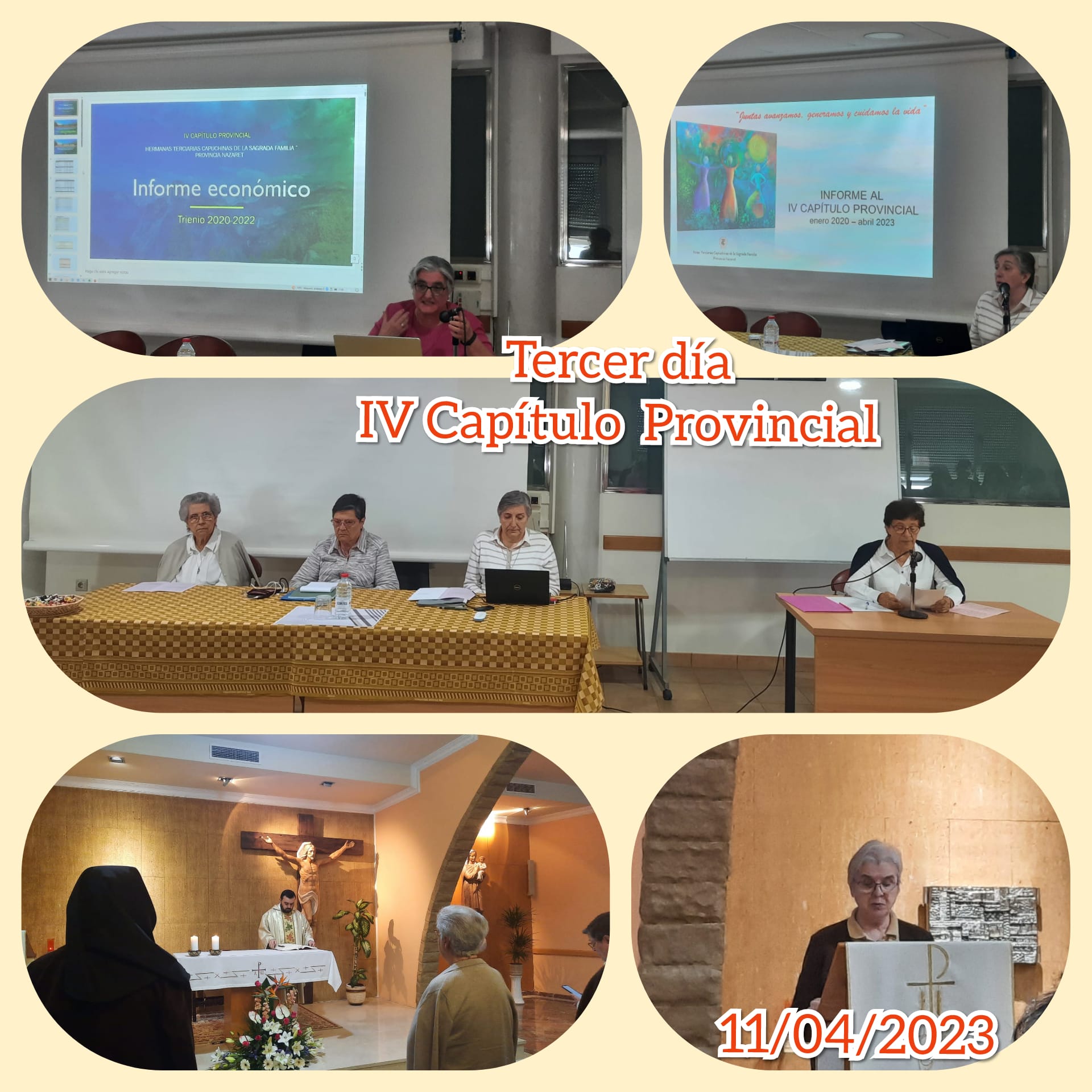 Las hermanas capitulares han empezado el día poniéndose delante del Señor para un momento de adoración, seguido por la oración de laudes y la Eucaristía presidida por D. Ricardo Fogués, párroco de Benaguacil. Durante la homilía el padre, ha animado las hermanas a vivir este único día, que es la octava de Pascua, con gozo y alegría. A continuación la Hna. Inmaculada Sancho presenta el Informe a la provincia, y la Hna. Soledad salesa el informe económico.